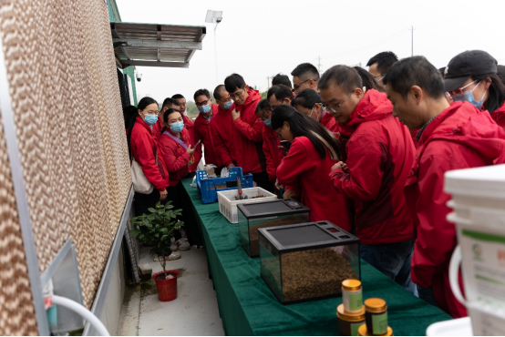 作为本次活动的最后一站,也是此次活动的重点,大家来到集团控股公司——武汉科微生物科技有限公司黑水虻产业化李集示范基地(以下简称”科微生物”)。科微生物是集团践行“国家战略有需要,产业市场有需求,科前布局有行动”的发展思路,针对国家饲用蛋白大量依赖进口的大背景下,紧密围绕国家替代蛋白战略,充分发挥黑水虻自身生活习性优势,在解决畜禽粪便等有机废弃物环保问题的同时,为社会提供优质蛋白和高效有机肥。